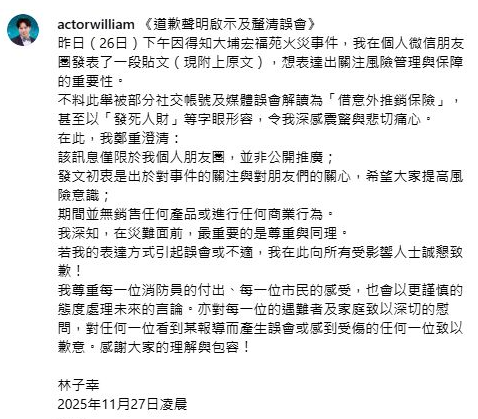 11月27日凌晨,林子幸也在社交媒体发出道歉声明及误会澄清。他提到,他在个人微信朋友圈发表帖文,是想表达关注风险管理与保障的重要性。“仅限于我个人朋友圈,并非公开推广,发文初衷是出于对事件的关注与对朋友们的关心,希望大家提高风险意识,其间并无销售任何产品或进行任何商业行为。”